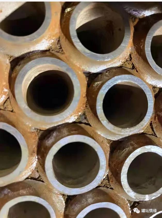 泄露现象:很多换热管与管板链接焊缝管板侧泄露,判断为管板腐蚀泄露。