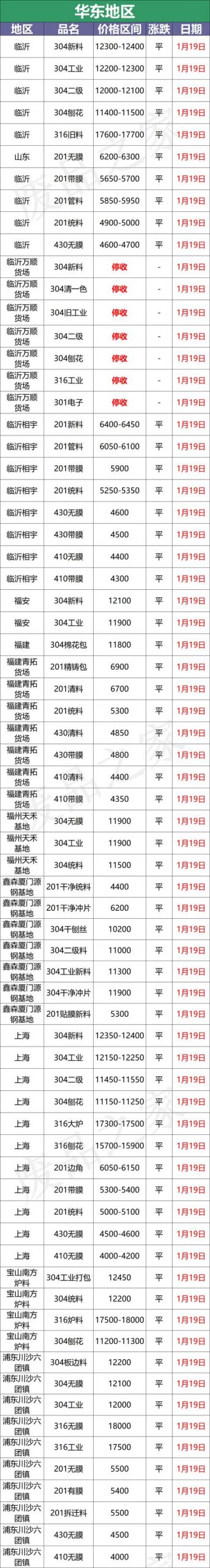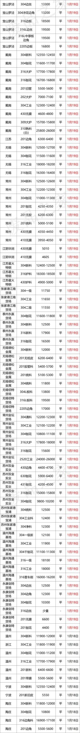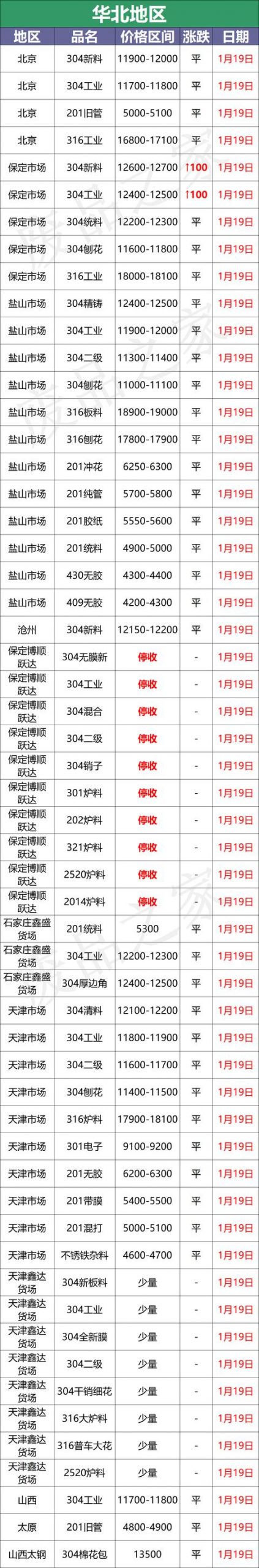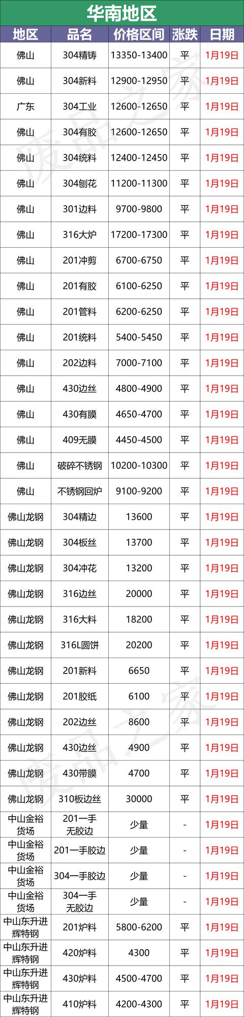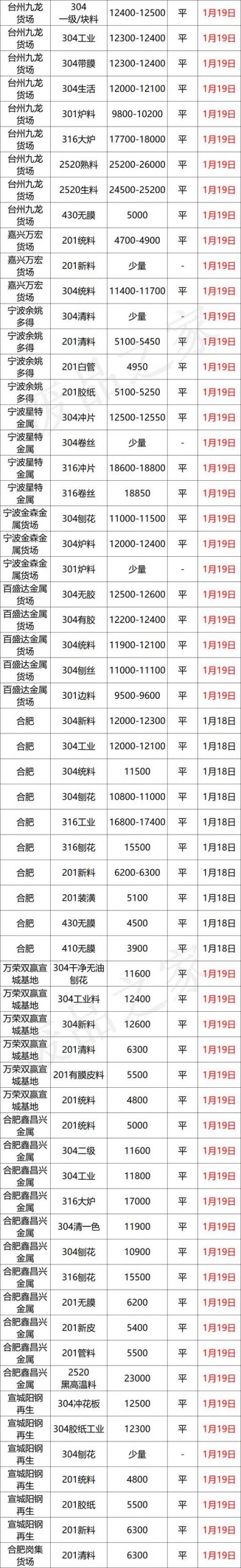 1月19日,今价持平运行,个别货少坚挺。华南市场佛山方面,304中频12900-12950,统料12400-12450,201冲剪料6700-6750,统料5400-5450,华北市场保定方面,304新料12600-12700涨100,料明平稳为主。