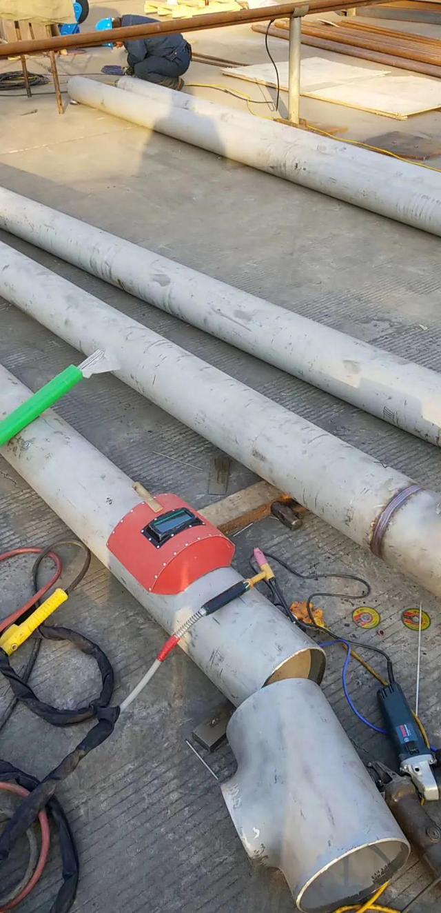 如果没有水溶纸的情况下,也可以用两块海绵中间距离40公分用铁链连接,绑上长铁丝拉到焊口中间做气室。注意用2块小木板打孔用螺丝固定,把海绵夹中间防止海绵拉坏留在管子里。然后焊口贴上纸胶带,用手背感觉一下氩气吹出来,等会就可以焊接了。