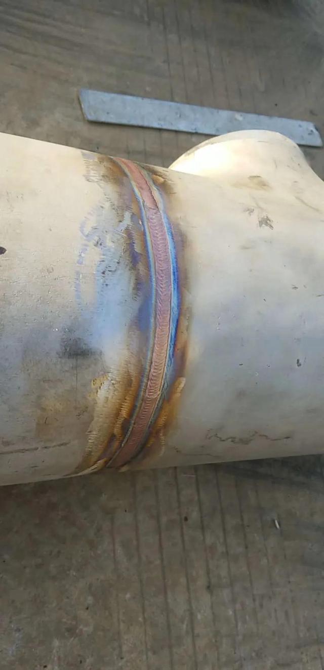 自保焊丝缺点外面有一层药皮容易打钨极,背部成型里面还容易有夹渣。优点是不用充氩气,节约成本效率高。这种焊丝我也是采用点丝方式,这样就不会夹渣了。采用高频率点丝法,电流略大一点,焊枪采用划圆圈的运条方式钨针压低。熔池一开始是浑浊的因为上面有药皮?;ぃ⒁庵兜憷戳?,等熔池前段打开缩孔,缩孔发亮的时候,也就是药皮往下和熔池分开的时候加入焊丝。如果药皮和熔池没有分开的时候加丝,背部成型会有夹渣。焊接方式都是大同小异只要细心琢磨就能精益求精