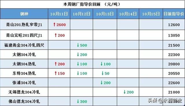 最主要原因是,青山大哥10月份的采购价格报至9995元,远低于节后12000的市场报价,二者间近2000的价差!让业内信心受到打击,近日高碳铬铁价格下滑至11500元/吨附近。青山钢厂新一轮304废不锈钢采购价报13500元/吨,较10月12日下调100元/吨,其他原料价位维持高位。