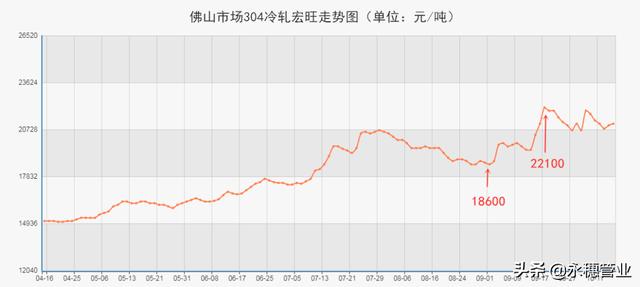 9月开始,在“能耗双控+限电限产”暴涨套餐下,不锈钢价格一骑绝尘,以佛山市场304冷轧宏旺为例,市场报价从18600元/吨飙涨3500元/吨至22100元/吨。