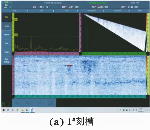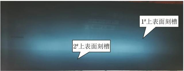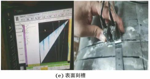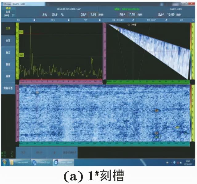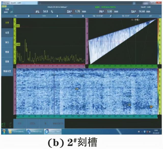 1号人工缺陷为垂直于工件的上表面刻槽;2号人工缺陷为平行于坡口面的上表面刻槽,倾斜角度为15°±2°,两种人工缺陷模拟的都是焊缝上表面裂纹,其检测结果如下: