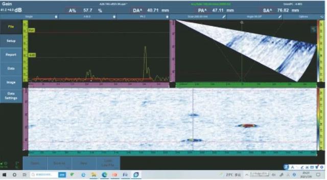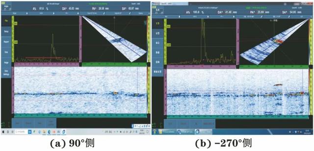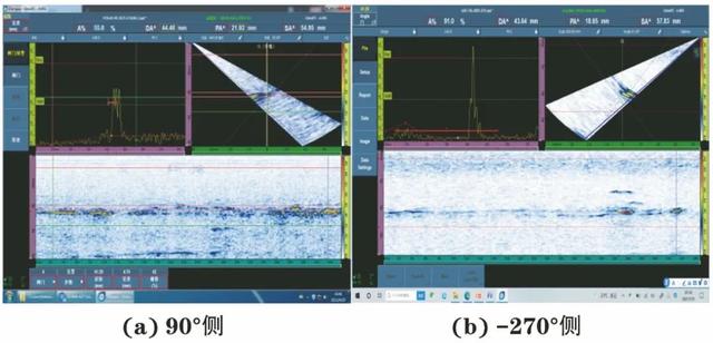 (3) 相控阵超声检测,A27+DNCR组合在焊缝两侧均能发现该缺陷,且有较好的显示效果,检测波幅分别为55%和91%,其结果如图20所示。