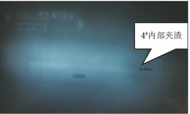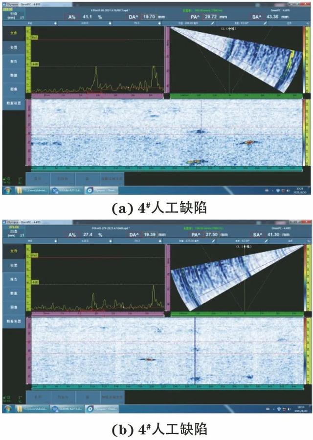 4号人工缺陷为内部夹渣,位于焊缝中心位置,其检测结果如下: