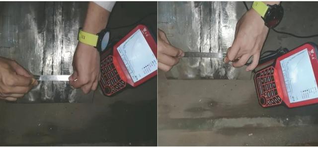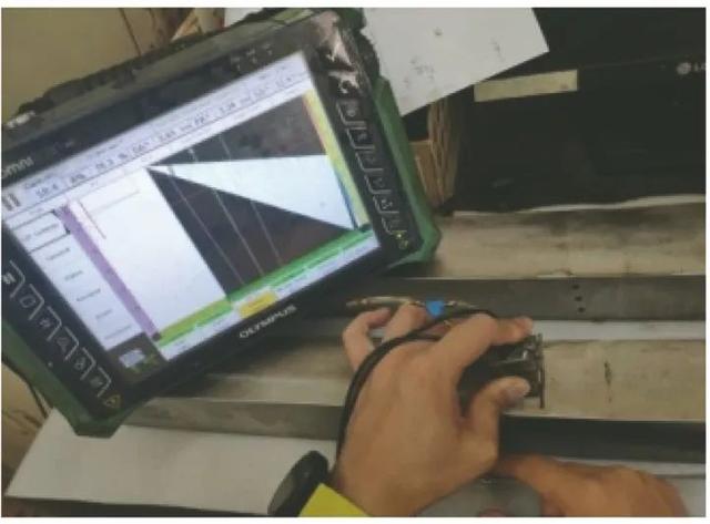 对于上表面刻槽,主要是利用爬波检测,设置检测角度为78°~83°。爬波是纵波从第一种介质中以第一临界角附近(±30′以内)的角度进入第二种介质时,在第二种介质中产生的沿介质表面下一定距离,在横波和表面纵波之间传播的峰值波。上表面缺陷检测时,将不同类型的探头与楔块进行组合,以观察检测效果,其检测现场示例如图4所示。