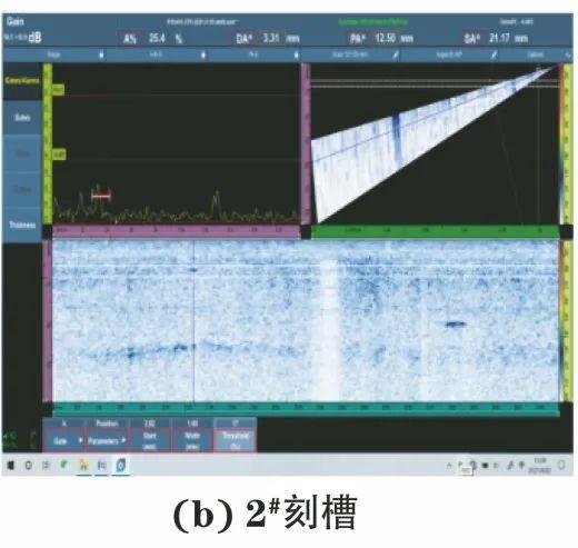 把焊缝盖帽磨平后,在焊缝中心采用A27+DNCR设备组合扫查时,可以发现焊缝边缘刻槽信号,1号刻槽波幅高度约为40%,2号刻槽波幅高度约为25%,其结果如图9所示。因此在焊缝中心检测时,需要仔细辨别超过20%波幅的上表面信号,必要时需要辅助表面检测方法加以验证。