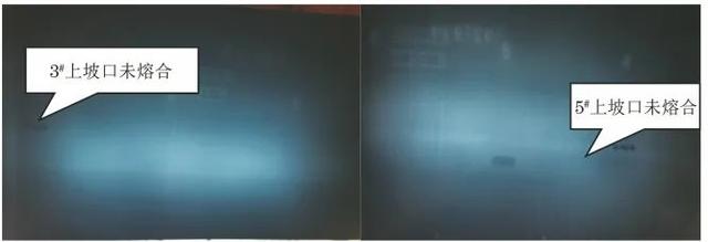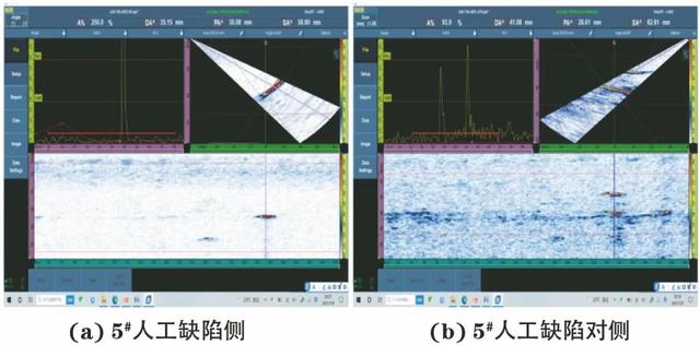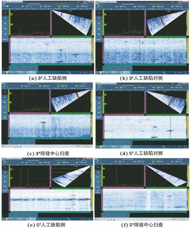 3号和5号人工缺陷分别位于焊缝两侧坡口熔合线处,且为上、下两个不同区域,检测结果如下: