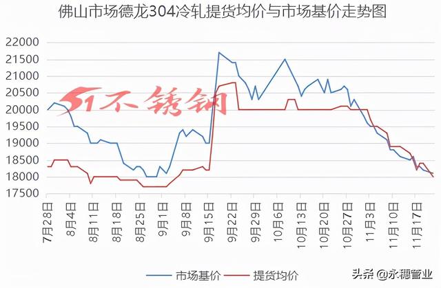 2021年11月22日佛山市场讯,小雪如约而至,不锈行情再续跌势。伴随今日钢厂盘价再度全面开跌,不锈钢现货再现低价,其中佛山市场德龙304冷轧午后失守18000,可见17900元/吨的基价。