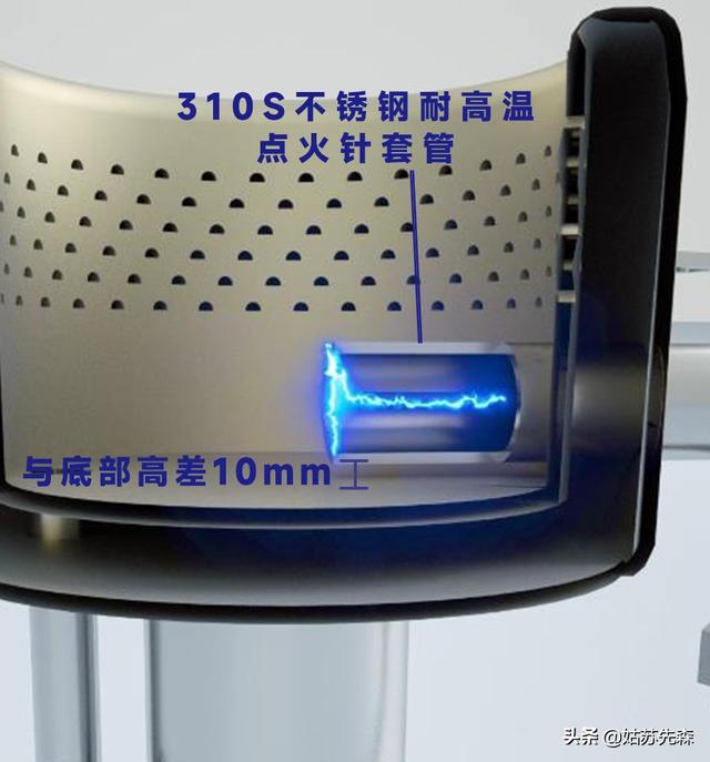 使用炉灶的厨师都很清楚,炉灶的点火问题是一个比较头痛的问题。即使点火针的材质是进口的耐高温SYTT材质制成,在试验过程中能够承受高温的考验,但到了实际操作使用中也会扛不住,高温的点火针遇到油水就很容易出现炸裂、不导电。我们为了能更好的保护好我们的点火针,延长他的寿命,特地给他在炉头内制作了一个“房子”,这个“房子”是由耐高温的310S不锈钢制成的套管,且与炉头底部设计了10mm的高差,减少了油水的侵害,更好的保护好点火针。