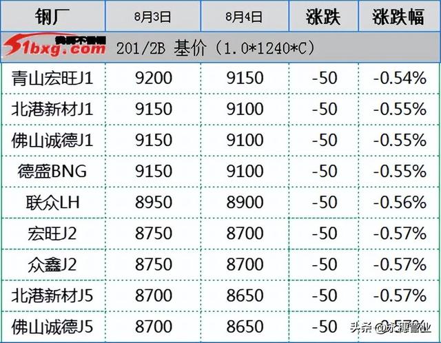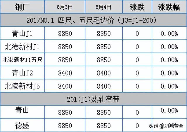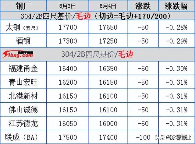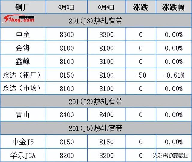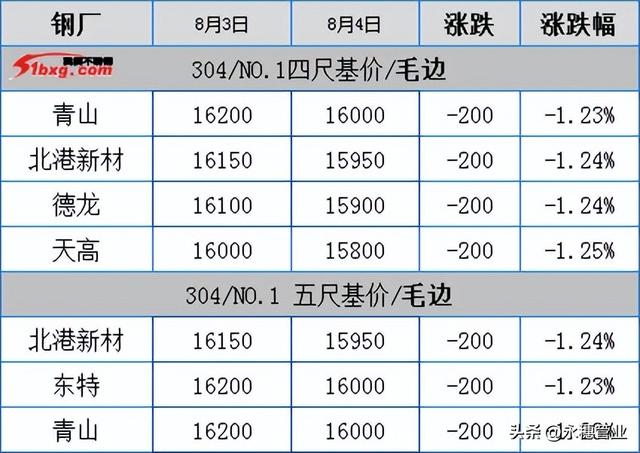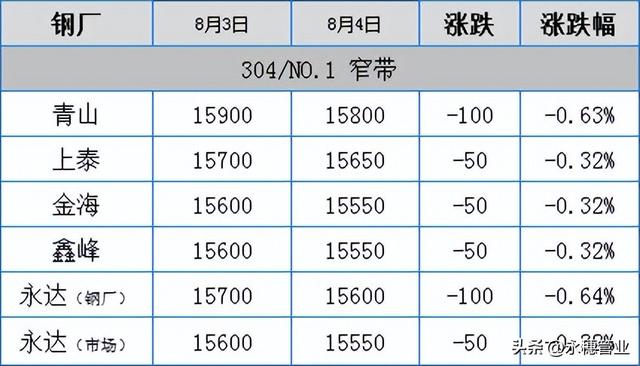 今日早间,青山代理经过几番调整报价后,最终统一报:304窄带现货较昨日下调100元/吨,冷轧15700元/吨,热轧15800元/吨;9月期货持平,冷轧15600元/吨,热轧15700元/吨。市场贸易商报价跟跌50-100元/吨,鼎信窄带不含税冷轧14400元/吨,热轧14500元/吨。其他产地窄带有:上泰期货含税15600-15700元/吨;鑫峰、金海、永达含税15500-15600元/吨。大板方面,市场报青山、北港新材、联众四尺及五尺16000-16100元/,部分低位在15800-15900元/吨。