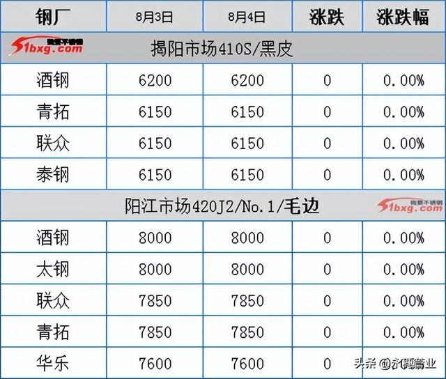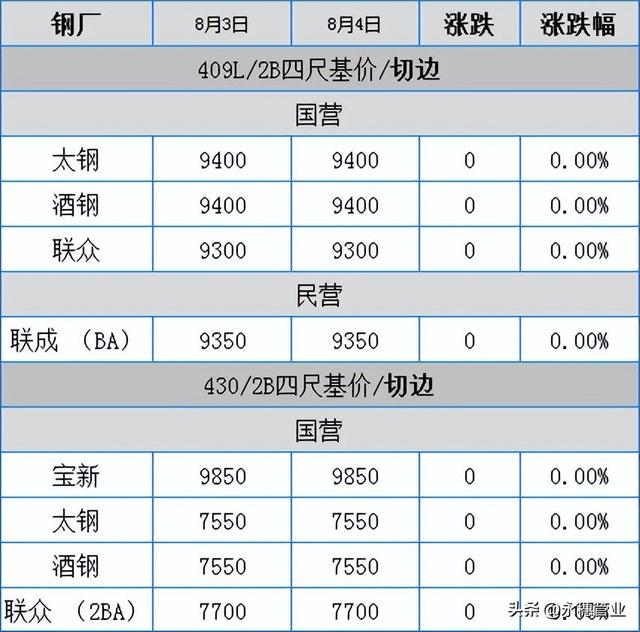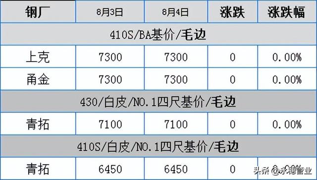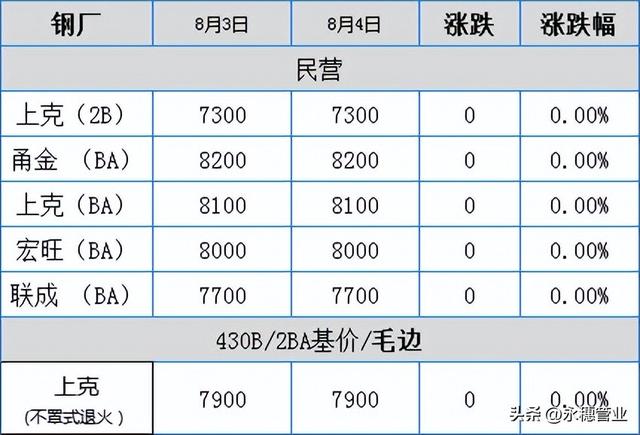 较昨日早间,今日早间市场报价持平,目前冷轧价格区间在:太钢/酒钢7500-7700元/吨、联众430/2BA(毛)在7500-7600元/吨、甬金430/BA(毛)8200-8300元/吨,上克430/BA(毛)8100-8200元/吨,宏旺430/BA(毛)8000-8200元/吨、联成430/BA在7700元/吨附近。